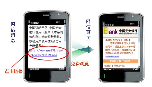 网信消息包含文本和链接,手机用户收到网信消息后,点击其中的链接即浏览网信页面。网信业务由集团客户付费,中国移动手机用户通过接入点CMWAP浏览网信内容免流量费。