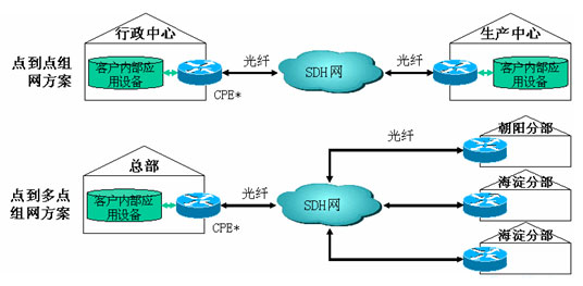 客户需求:客户有两个或更多不同的办公地点,例如总部与分公司,行政中心与生产中心等。为实现不同办公地点之间的语音、数据等内容的访问与共享,需要在各个办公地点之间建立网络连接。