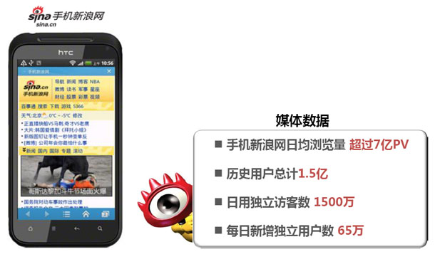 与手机新浪网、手机凤凰网、3G门户、UC浏览器等流量最大的门户网站紧密合作。涵盖90%以上用户手机流量。高流量、优质的媒体品牌都将有助于提升广告效果。