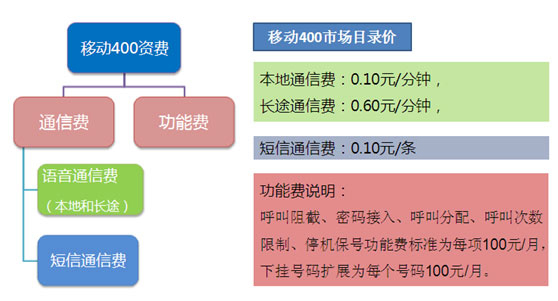 移动400费用由集团客户支付的通信费、功能使用费等组成:
