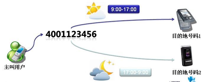 当主叫用户发起一个移动400的呼叫时,系统可以按照主叫用户发话时的时间选择路由,接续到集团客户预设的目的地号码。