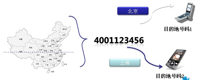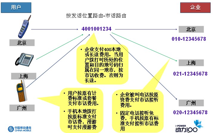 当主叫用户发起一个移动400的呼叫时,根据集团客户之前的设置,系统可以根据主叫用户发话时所在的地理位置选择路由,接续到集团客户预设的目的地号码。