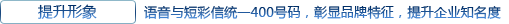 2.统一形象:语音(4001ABCDEF)与短信(10657+4001ABCDEF)号码呼应,加深客户对企业的认知度;企业向客户发送短信时,企业签名包含在短信末尾,彰显品牌特征,提升企业形象!